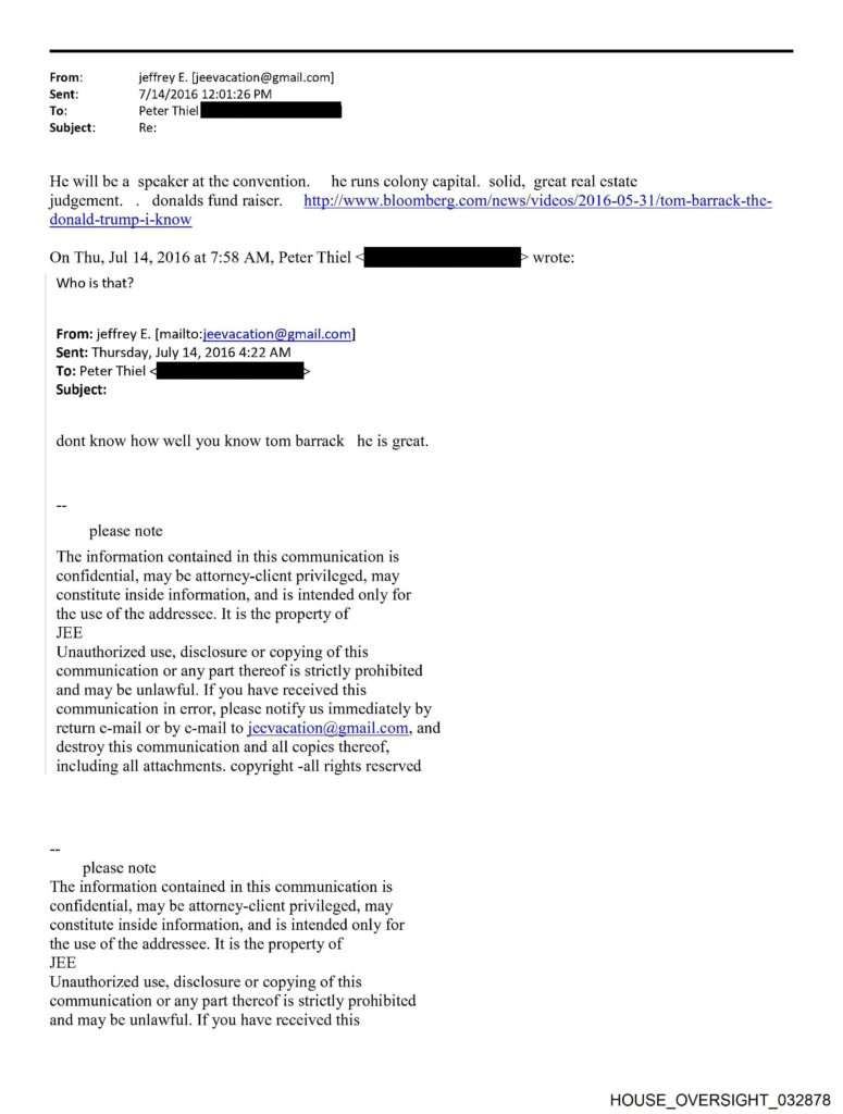 A few months later, Epstein wrote to businessman Peter Thiel, “dont know how well you know tom barrack he is great.” Epstein would go on to introduce Thiel and Barrack separately to Russian Ambassador to the United Nations Vitaly Churkin, according to schedules obtained by The Wall Street Journal. Thiel told the Journal that Epstein was “a crazed networker and low on substance,” adding, “I didn’t think enough about what Epstein’s agenda might have been.”