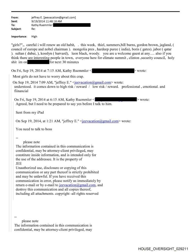 In a 2014 email, Epstein joked to a friend about the danger that her talk about “girls” will “renew an old habit.” Then he listed all the meetings he had lined up during the U.N. General Assembly in New York. They included power brokers from America, Europe, the Middle East, and beyond.