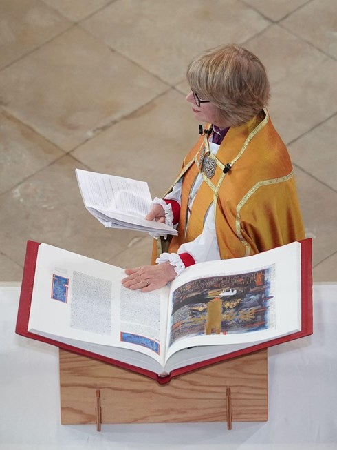 A second hymn followed — “Thy hand, O God, has guided” — before the Archbishop of York — who has held the reins since the departure of Archbishop Welby — invited her to affirm her assent to the canons and creeds of the Church of England, and swear an oath on the scriptures. For this, a new Bible, the St John’s Bible, decorated with contemporary illustrations inspired by historical illuminations, was used for the very first time, in place of the sixth-century Augustine Gospels, which were used for this purpose until 2013, but are now too fragile to be moved.