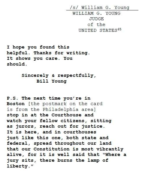Judge Young did not take my advice. Instead, he styled a judicial decision as a 161-page letter to an anonymous postcard writer. It began in this fashion: