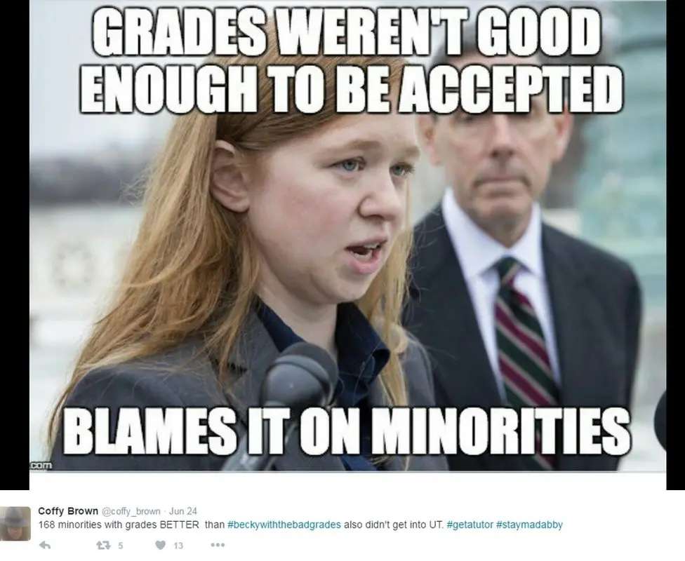 There is another relevant example involving students. Everyone knows Abigail Fisher, the lead plaintiff in the challenge to the University of Texas’s affirmative action. And she was excoriated. Remember #BeckyWithTheBadGrades? This meme was shared by the BBC.