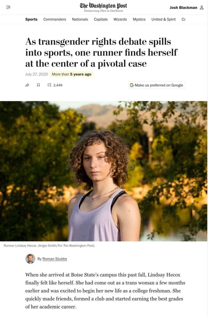 Back to Hecox. In July 2020, Hecox was content to have a glamor photo appear in the Washington Post. Everyone knew this case was headed to the Supreme Court. And Hecox’s counsel thought it was a strategic benefit to plant favorable press stories. But now, on the eve of a Supreme Court decision, Hecox’s counsel wants the case to go away. It is a bit rich to claim that this pressure has now affected Hecox’s decision to drop out of the case.