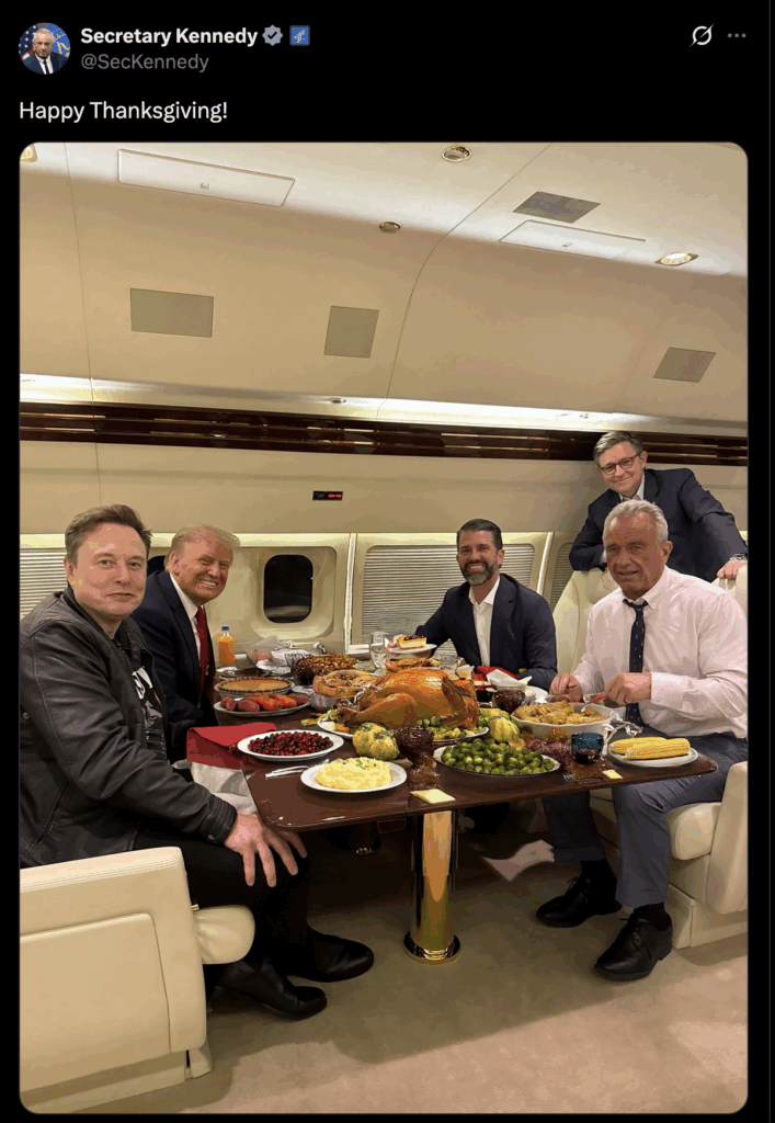 • Health and Human Services secretary Robert F. Kennedy Jr. shared a Thanksgiving greeting on X with a picture of himself enjoying what appears to be an AI-generated (or at least very badly Photoshopped) Thanksgiving feast aboard Air Force One. As many users pointed out, the image appears to be a revised version of an image from November 2024 in which Kennedy, Donald Trump, Donald Trump Jr., Elon Musk, and House Speaker Mike Johnson were eating McDonalds.