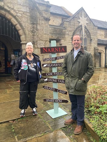 Throughout St Bartholomew are wooden panels depicting Lucy, Edmund, Peter, and Susan, and their adventures in a land under the thrall of the White Witch. From the rafters, Edmund can be seen being carried off by the witch’s henchmen. Professor Kirk greets visitors at the door.