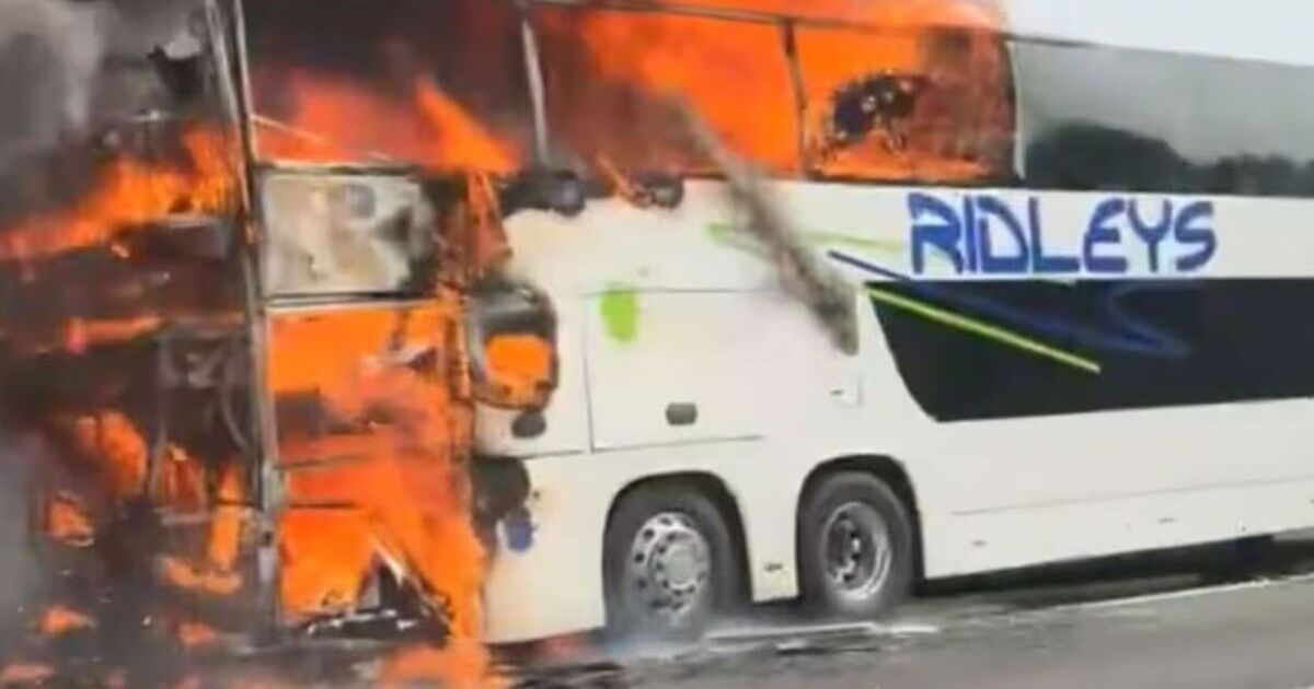 Footage of the incident shows people gathering on a grassy mound near the burning coach, watching the smoke rise.
