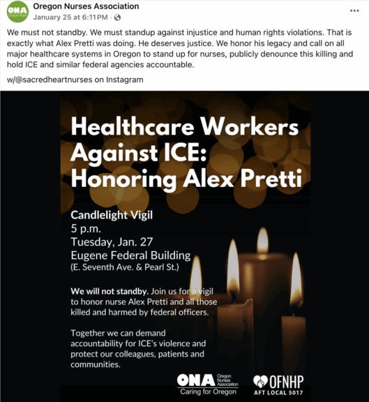 “We must not standby. We must stand up against injustice and human rights violations. That is exactly what Alex Pretti was doing,” the post said. “He deserves justice. We honor his legacy and call on all major healthcare systems in Oregon to stand up for nurses, publicly denounce this killing and hold ICE and similar federal agencies accountable.”