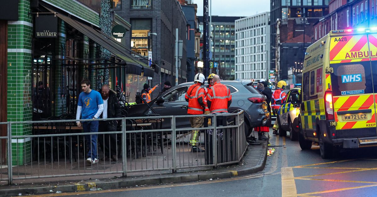 A police cordon has been put in place around the pavement and car after pictures appear to show it crashed into a row of railings outside the Wayfarer bar, on the corner of Oldham Street. The vehicle involved – an MG 4×4 – has a crashed front bumper after smashing through the metal barrier, leaving debris scattered all over the pavement. The crash involved one vehicle and is understood to have occurred after a suspected medical episode involving the driver. Greater Manchester Police said no arrests have been made. The driver was taken to the hospital.