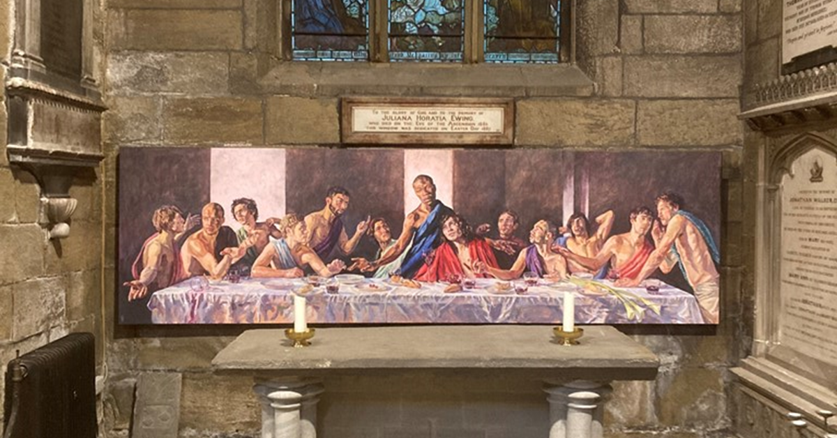 The artist, Lorna May Wadsworth, who grew up in the parish, is known for a series of life portraits, including Margaret Thatcher’s, as well as this 2009 work. Twelve feet long, it was painted from life. The figure of Jesus is based on the black fashion model Tafari Hinds.