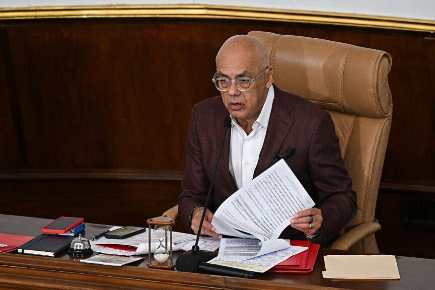 Venezuela’s National Assembly President Jorge Rodriguez speaks during an extraordinary session at the National Assembly in Caracas on December 23, 2025. (Photo by Federico PARRA / AFP via Getty Images)