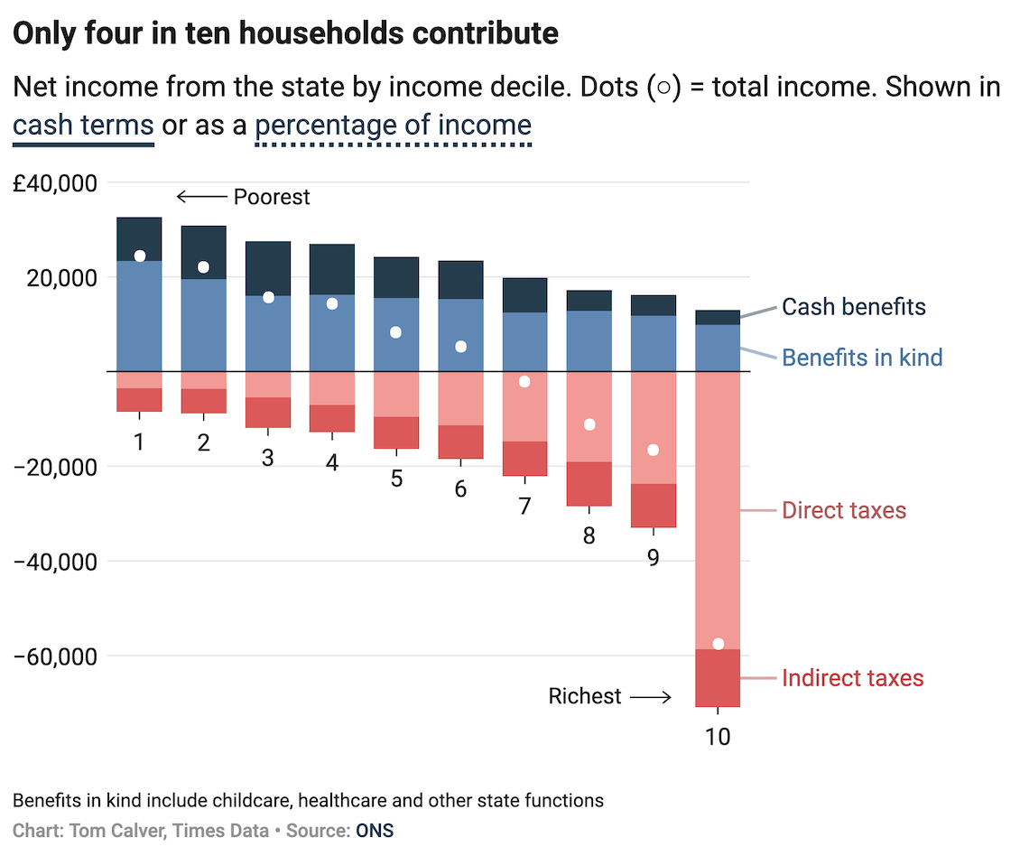 Putting the numbers together reveals something stark. Nearly two thirds of households take more from the state than they pay into it.