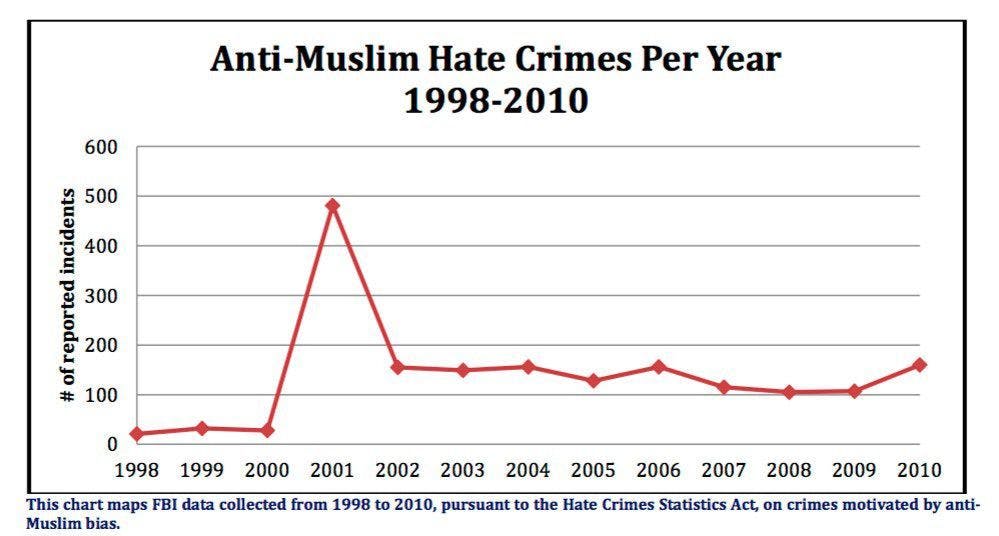 And even given this definition — which is extremely overbroad — there were still fewer than 500 hate crime reports involving Muslim victims, across the entire country, in the aftermath of 9/11. So there was one hate crime report for every five people who burned to death, or jumped out of a burning building, or died in a plane crash on 9/11. And we’re supposed to be horrified by these numbers. Compare those figures to other religious groups, and the narrative falls apart even further.