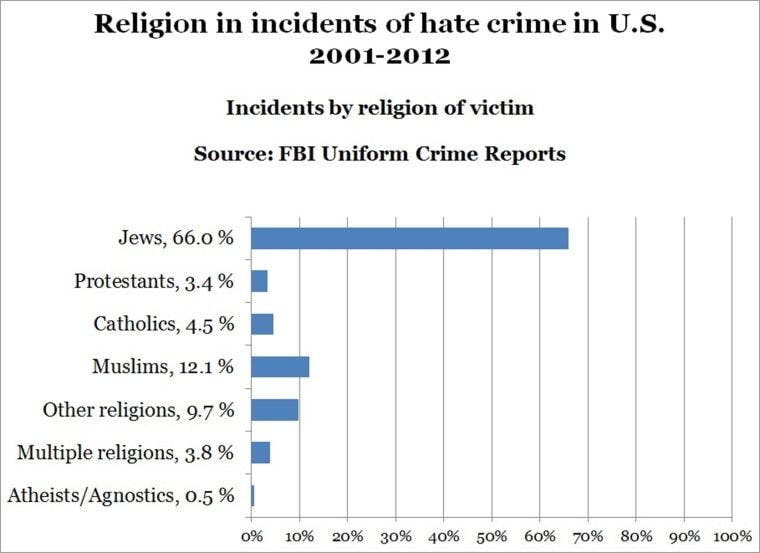 Using the FBI’s numbers, from 2001 to 2012, hate crimes against Muslims were reported roughly as often as hate crimes against Christians (including Catholics and Protestants). Jews are at the top of the list. The category of “other religions” and “multiple religions” together reported more hate crimes than Muslims.