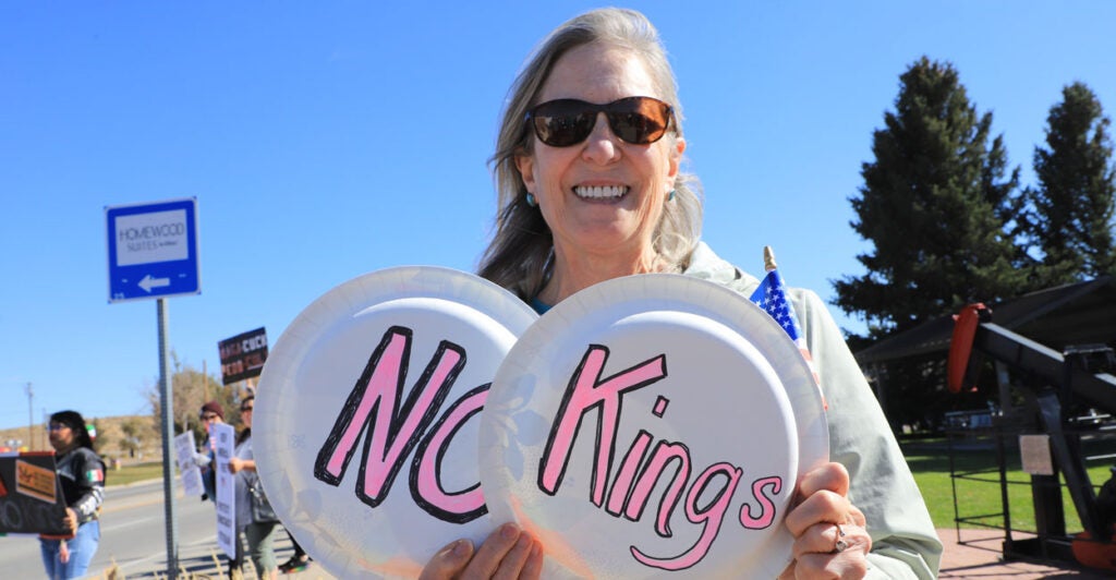 A woman takes part in a “No Kings” protest in Rock Springs, Wyoming, on Saturday. (Shi Chun/Xinhua via Getty Images)