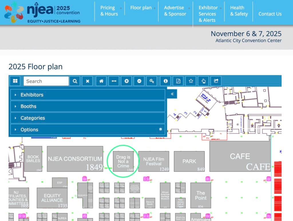 The convention’s floor plan also includes a booth dedicated to the drag theme. The NJEA convention theme puts “learning” third—after “equity” and “justice.”