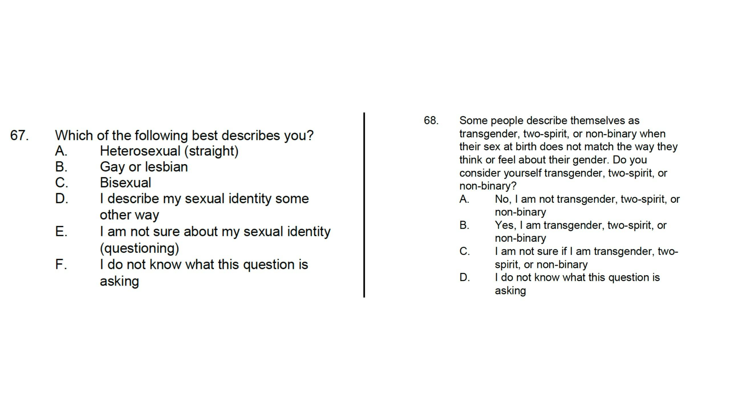 Another question said, “Some people describe themselves as transgender, two-spirit, or non-binary when their sex at birth does not match the way they think or feel about their gender. Do you consider yourself transgender, two-spirit, or non-binary?”