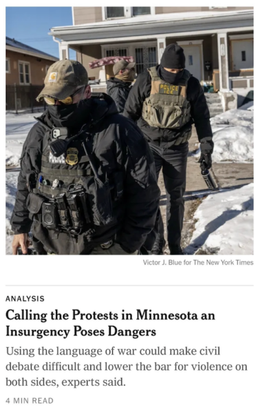 I suppose the real reason the Times doesn’t like “insurgency”–I am sure they disapprove of “insurrection,” too–is that an insurgency isn’t a peaceful protest, or a mostly peaceful protest, which is the lie that the Times, along with all other spokesmen for the Democratic Party, tell about the insurrection that is going on in Minnesota.