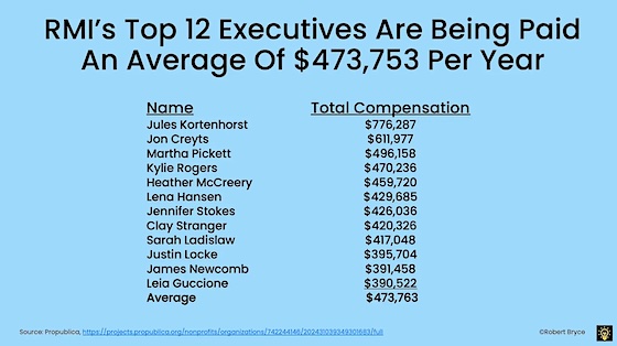 Nice work if you can get it. Working for an organization that is funded by corporations, dark money and the federal government can be lucrative. RMI’s top dozen employees are paid an average of over $473,000 a year: