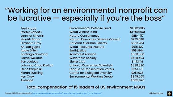 When billions of dollars are being tossed around with zero accountability, it is no surprise that the people in charge of spending the money nip off a good bit for themselves. In some cases, more than $1 million a year. Robert Bryce gives us this helpful chart showing the reported salaries of the CEOs of the 15 largest environmental organizations: