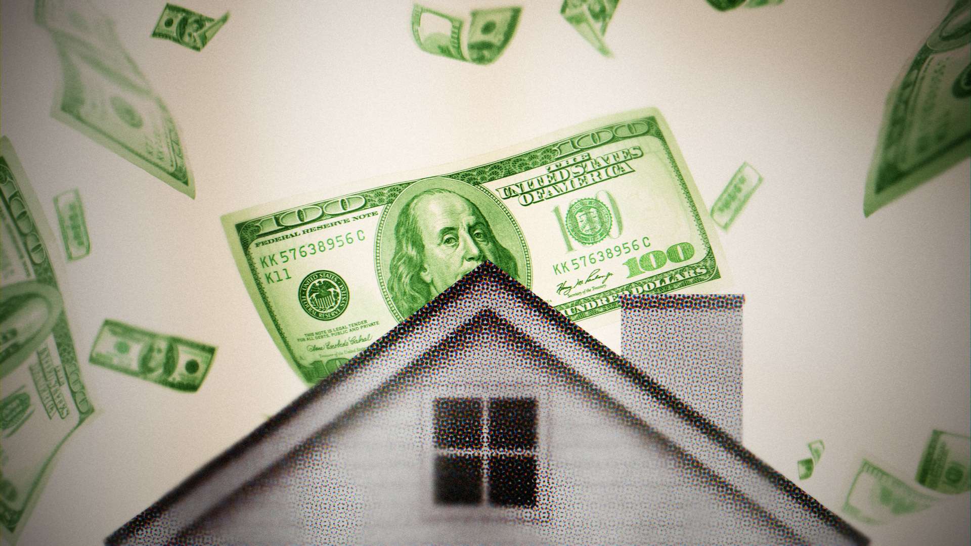 A house is seen with $100 bills falling behind itA house is seen with $100 bills falling behind it