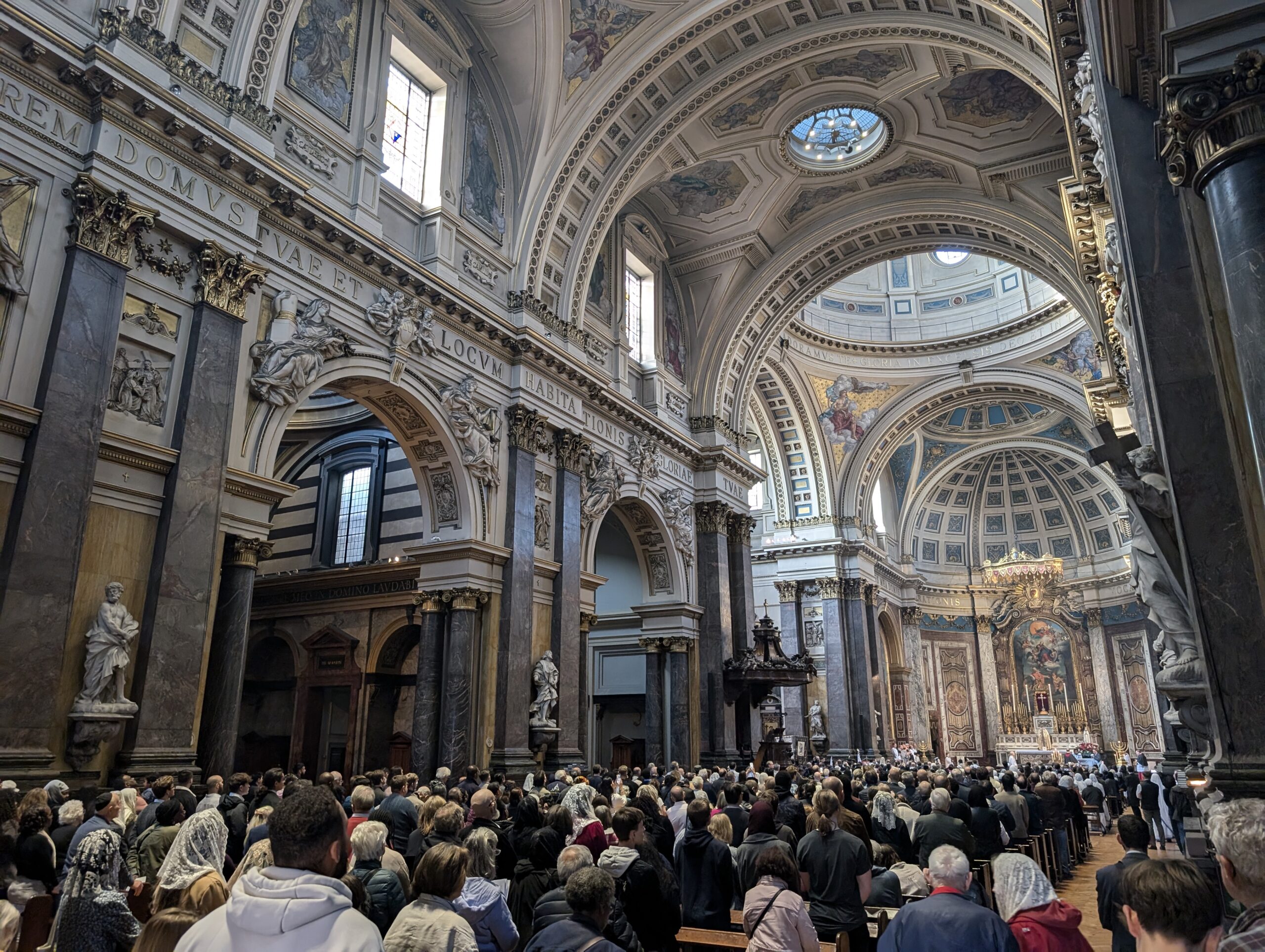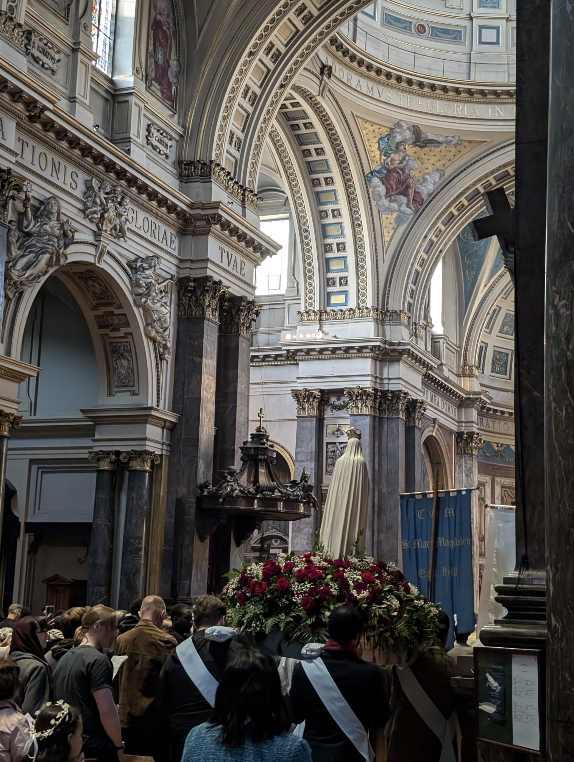 The procession’s devotional life has remained deeply traditional. Alongside English hymns such as Faith of Our Fathers and Hail, Queen of Heaven, participants pray the Rosary and chant Latin prayers including the Credo, Pater Noster, Salve Regina, Gloria, and the Eucharistic hymns Tantum Ergo and O Salutaris Hostia. The event includes consecrations to the Immaculate Heart of Mary, prayers to Christ the King, the Prayer for England written by Leo XIII, and culminates with solemn benediction in the Oratory with its choir. Pilgrims are then invited to enrol in the Brown Scapular, extending the day’s graces into their personal devotion.