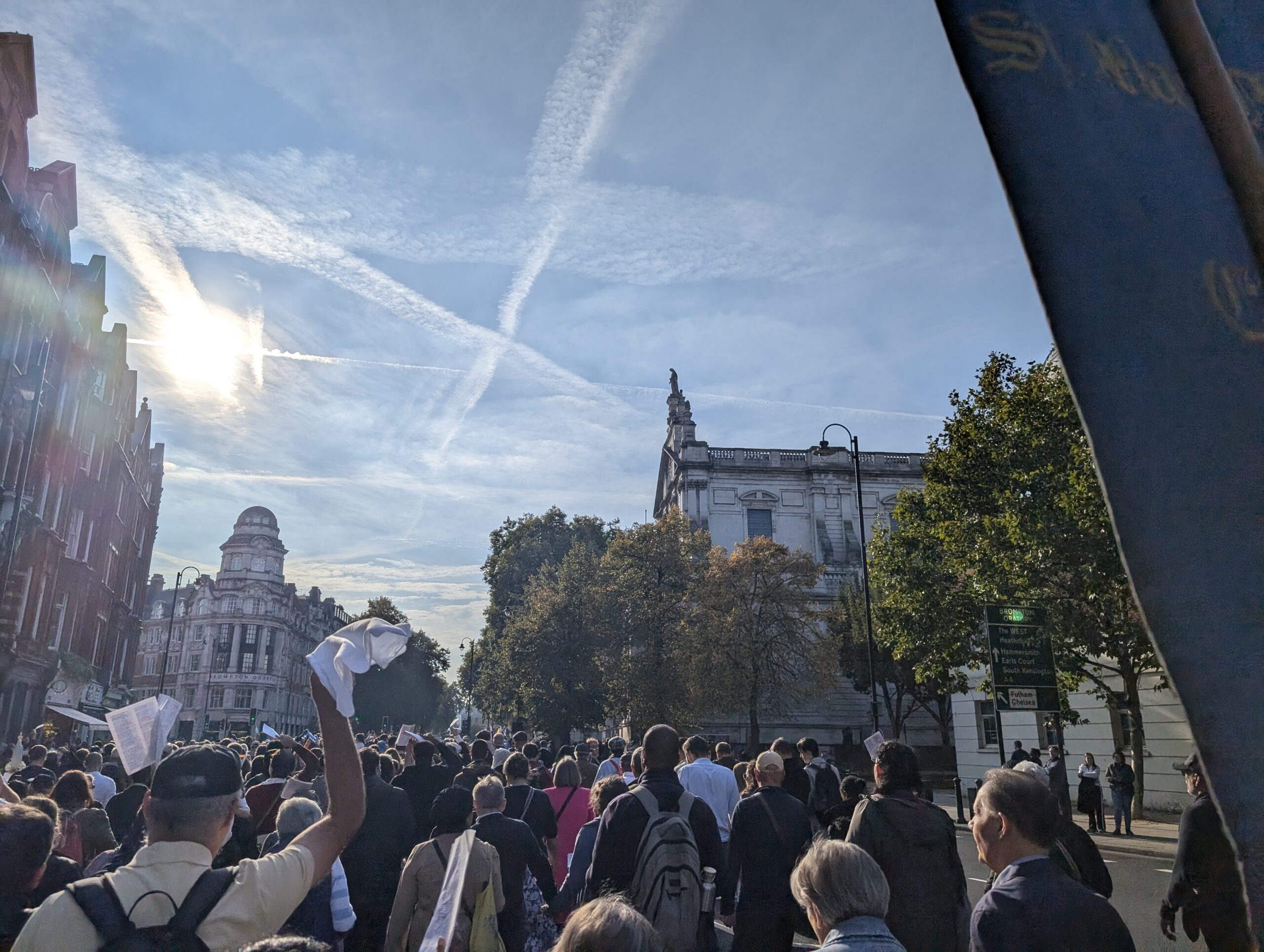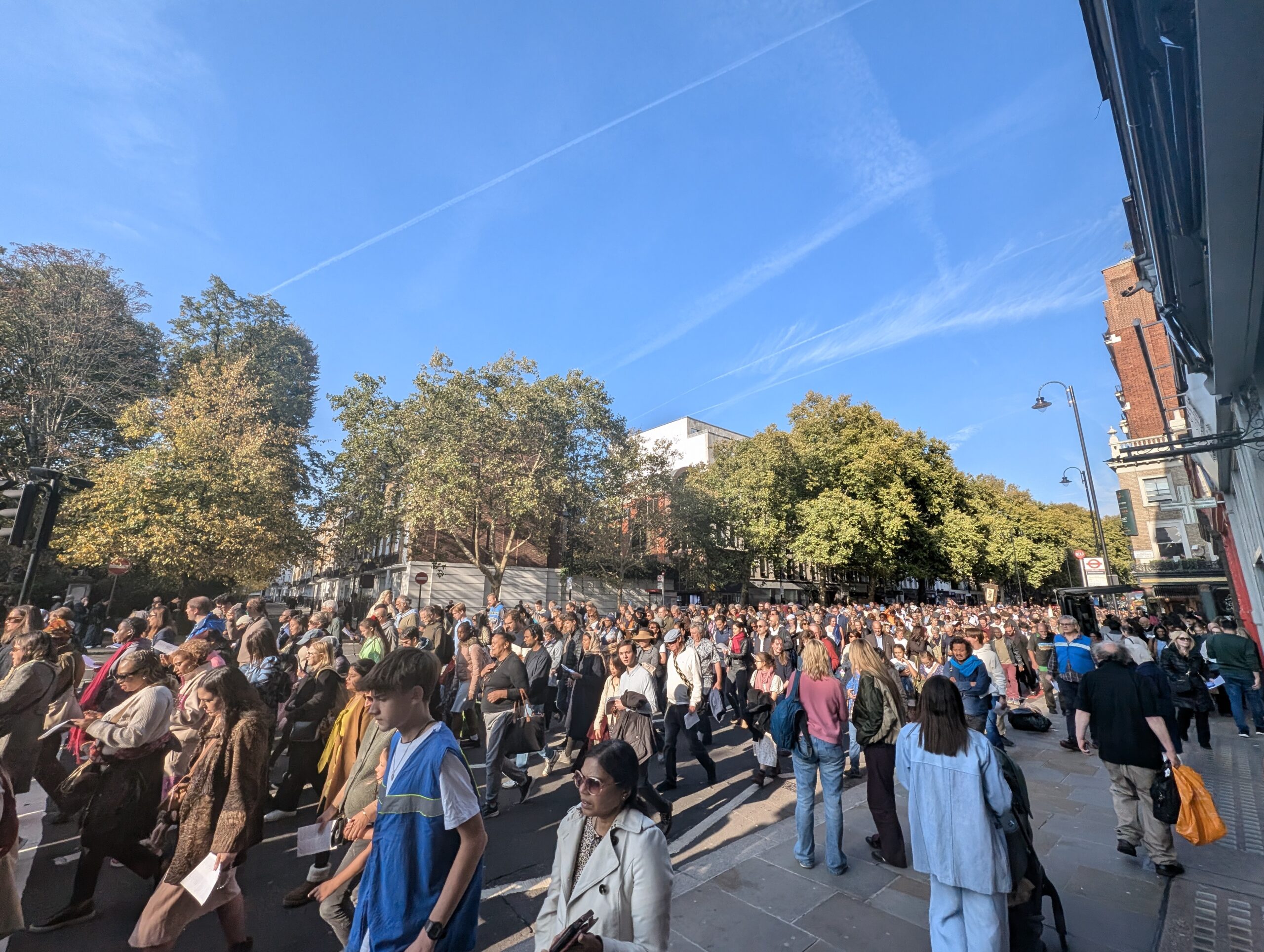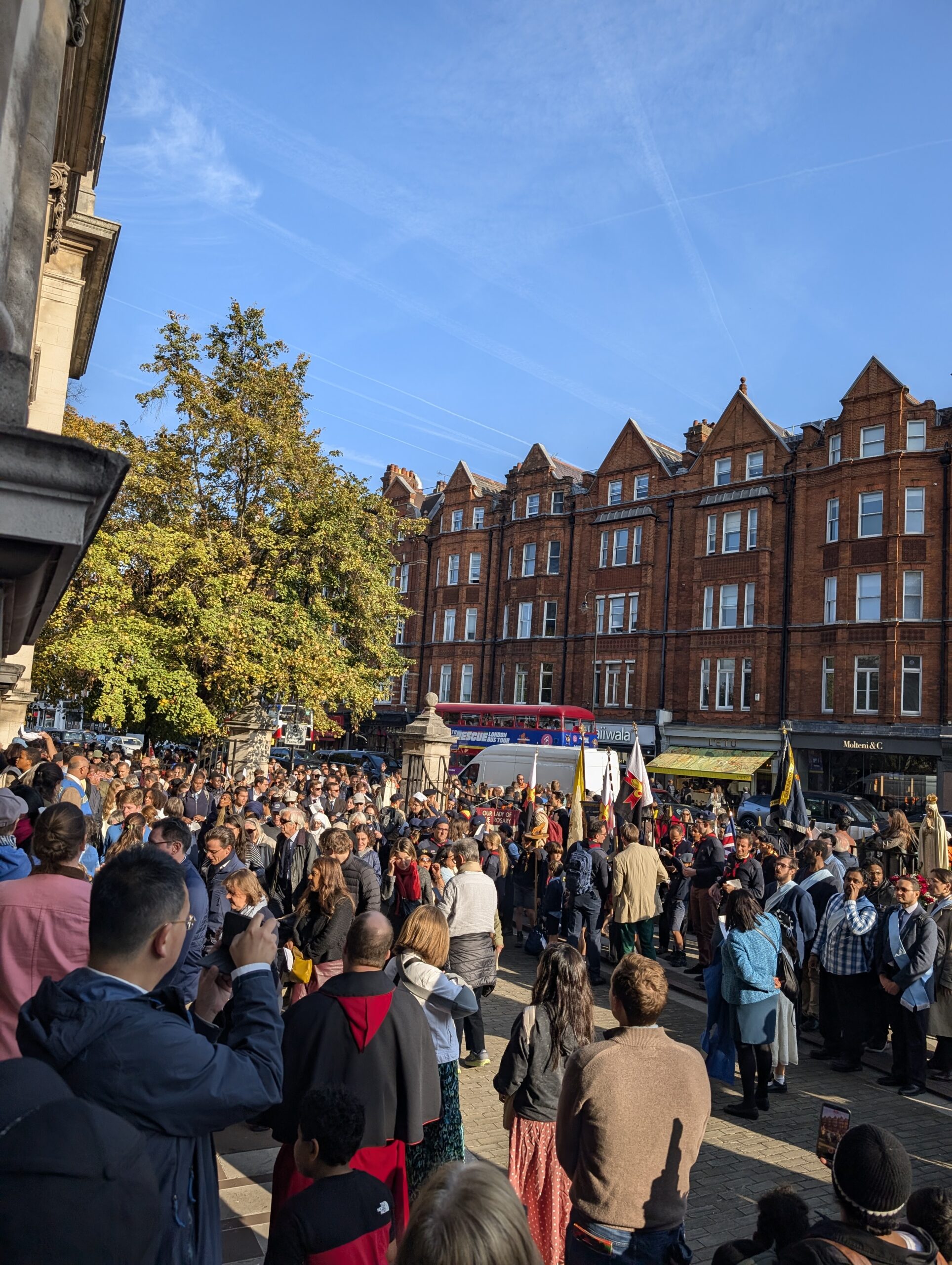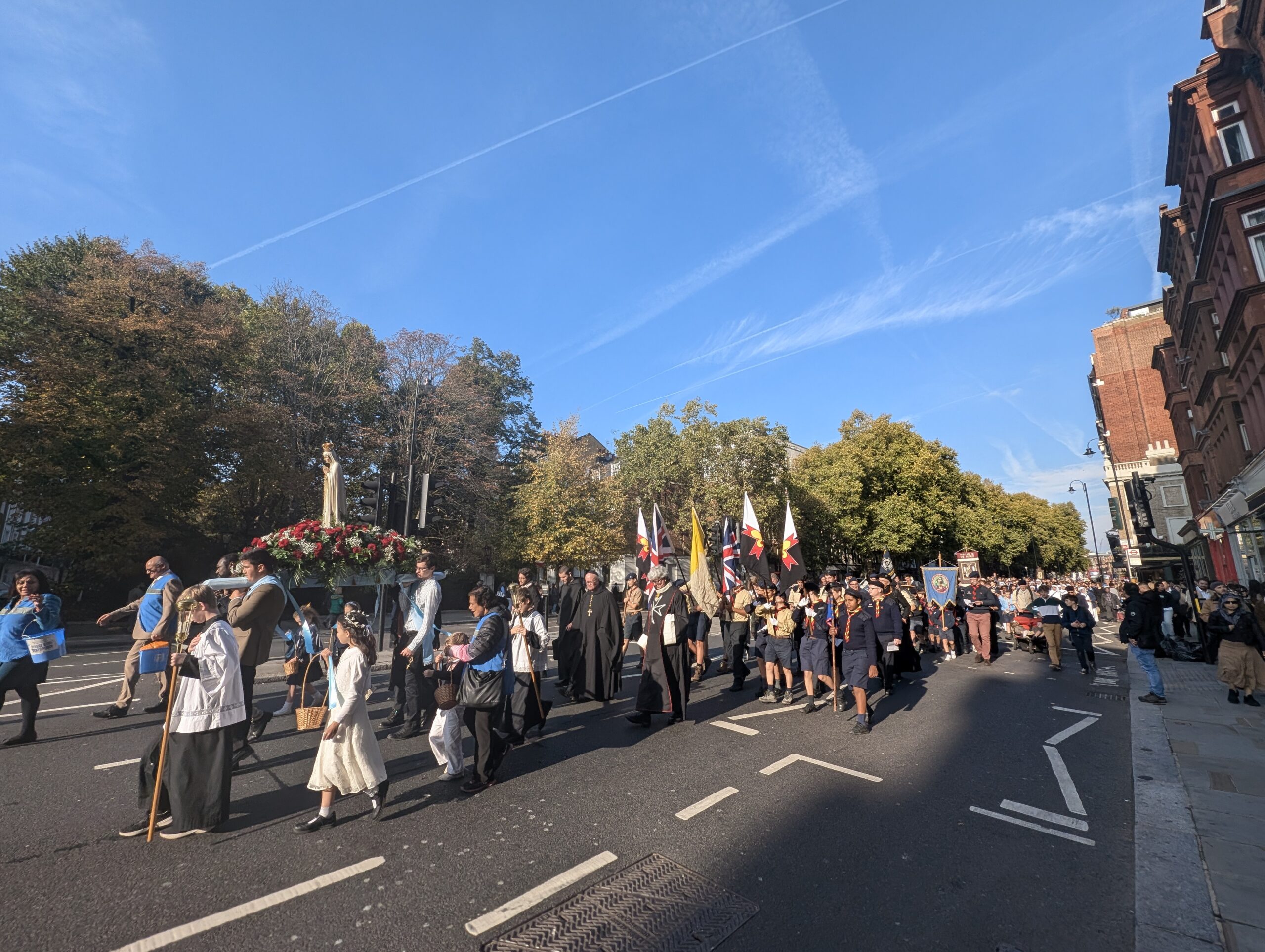 Under the autumn sun, a statue of Our Lady of Fatima was carried through Belgravia and Knightsbridge, flanked by banners proclaiming “Reparation” and “Peace.” Hymns such as Faith of Our Fathers and Hail, Queen of Heaven mingled with the Latin strains of the Salve Regina and Credo as the crowd processed past embassies, department stores, and curious onlookers.