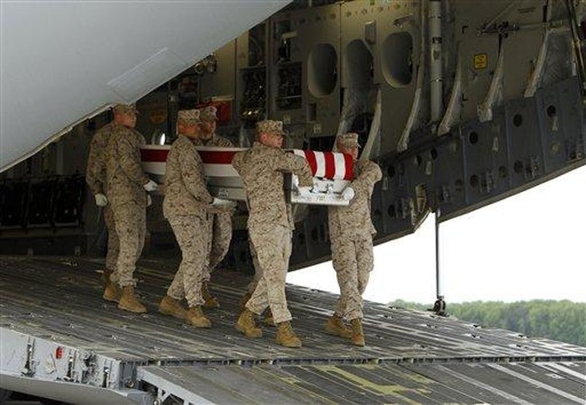 At one point, a large group of soldiers boarded the back of a plane parked on the tarmac, and when they exited, they were carrying coffins draped with American flags.