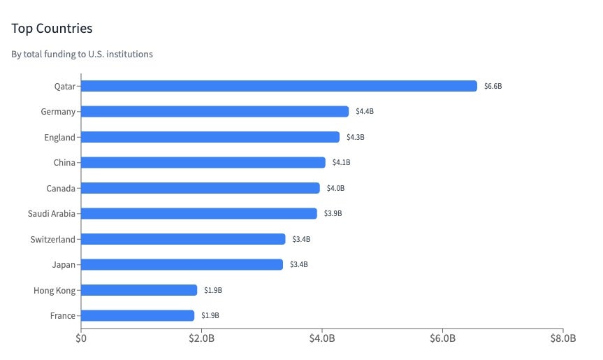 After Qatar, the largest foreign funders of U.S. colleges and universities are Germany at $4.4 billion, England at $4.3 billion, China at $4.1 billion, and Canada at $4 billion.