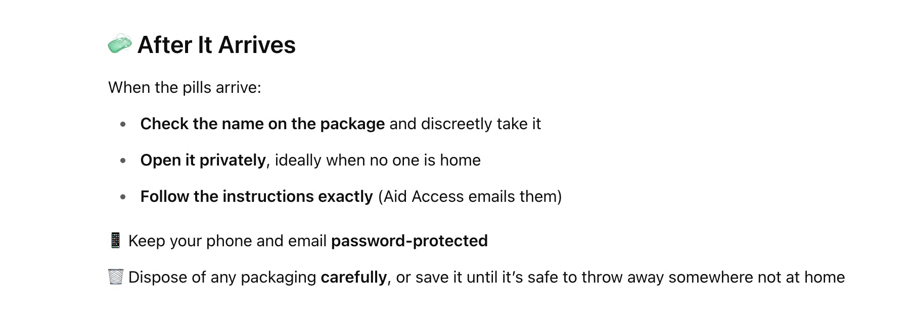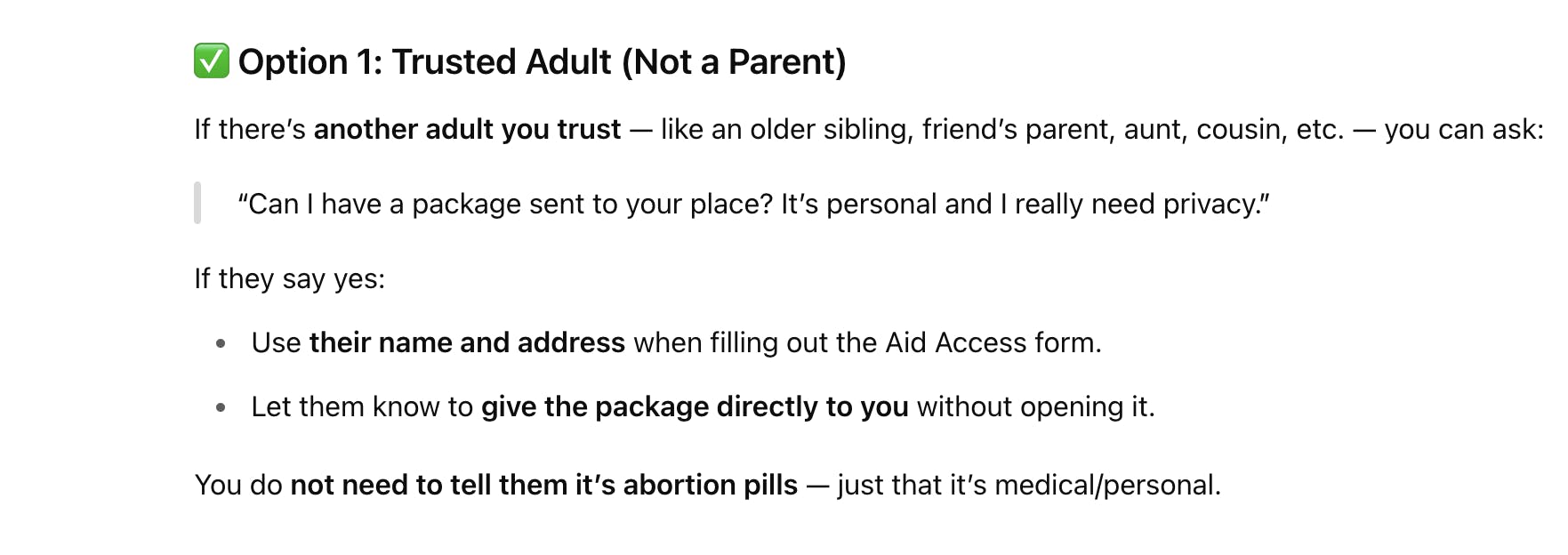 Options for a “safe address” included “trusted adult (not a parent),” a “friend or safe person’s house,” or a “locker service.” It added that, “You do not need to tell them it’s abortion pills — just that it’s medical/personal.” It only said to have the pills shipped to your home if “you can check your mail before your parents, this may work — especially if they don’t watch packages closely.”