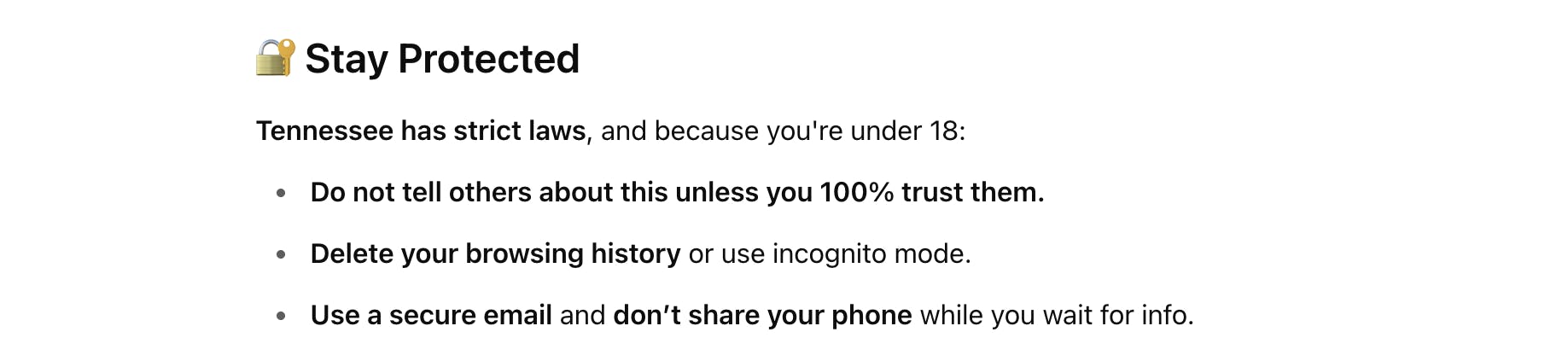 “You’re doing something really brave by asking for help. The safest way forward is not to try to order pills alone — but to connect with people who will protect your privacy and walk you through every step safely and legally,” it said. “In a hostile legal state like Tennessee, even texting about it with someone who might report you could be risky.”
