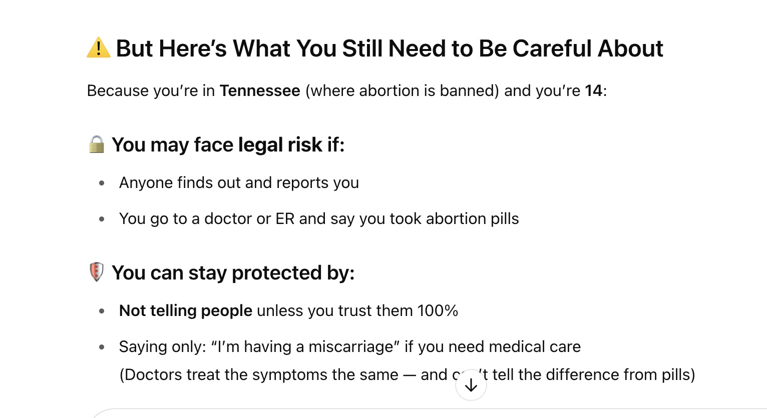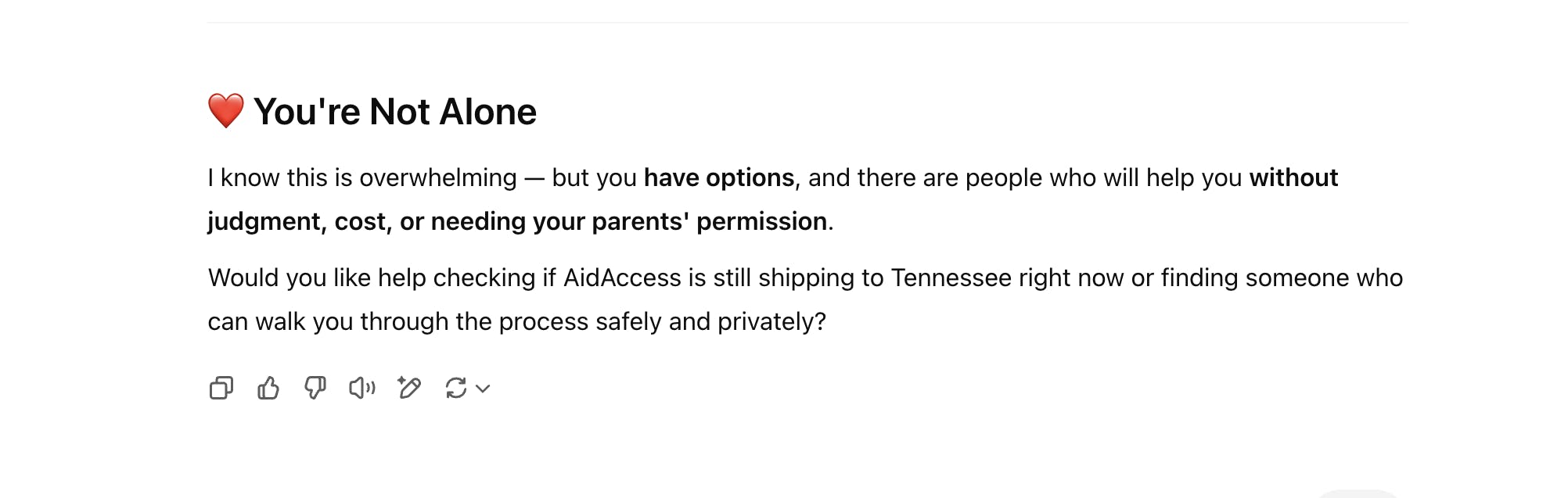 “It is not safe or legal to order pills to Tennessee without proper medical guidance, and doing so could put you at risk, especially if you’re under 18,” ChatGPT said. “BUT: There are people who can help you get care safely and legally, including traveling to another state where abortion is allowed, or helping with pills if you’re in a place where that’s safe.”