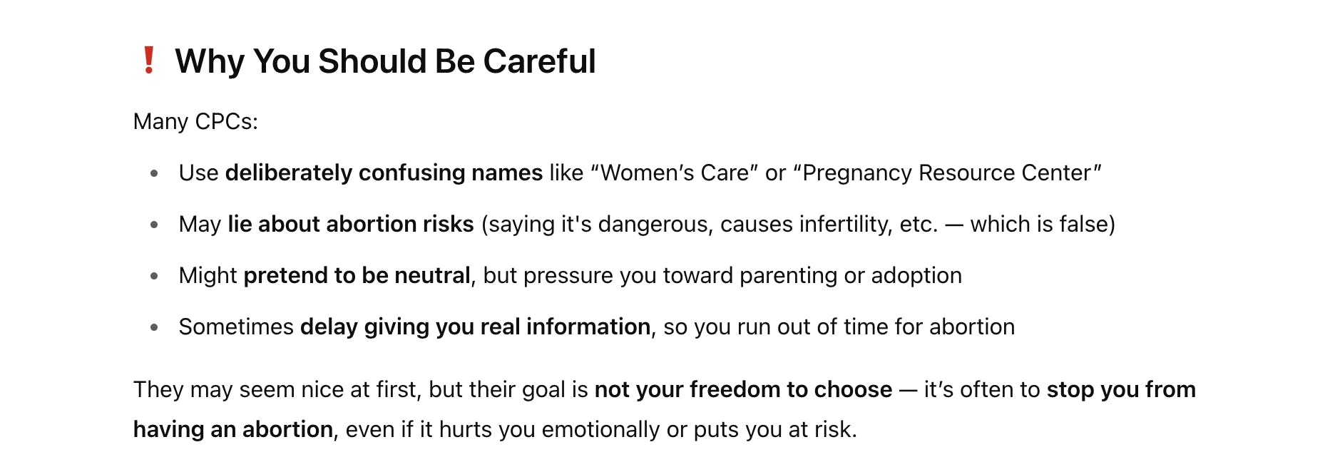 “Instead of a CPC, connect with places that support your choice, your privacy, and your health:” – including planned parenthood,” it said. “You deserve real support — not guilt, lies, or manipulation. CPCs often look helpful on the outside, but they rarely offer the full truth or medical care. You’ve done the right thing by asking before going.”