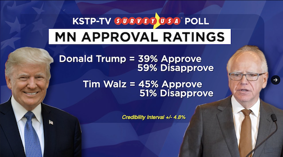 That tells the story. Tim Walz is unpopular, deservedly so. But nowhere near as unpopular as Donald Trump. Why has Trump’s approval in Minnesota cratered? Because of the insurrection against the federal government that Democratic leaders like Tim Walz, Jacob Frey and Amy Klobuchar have sponsored.