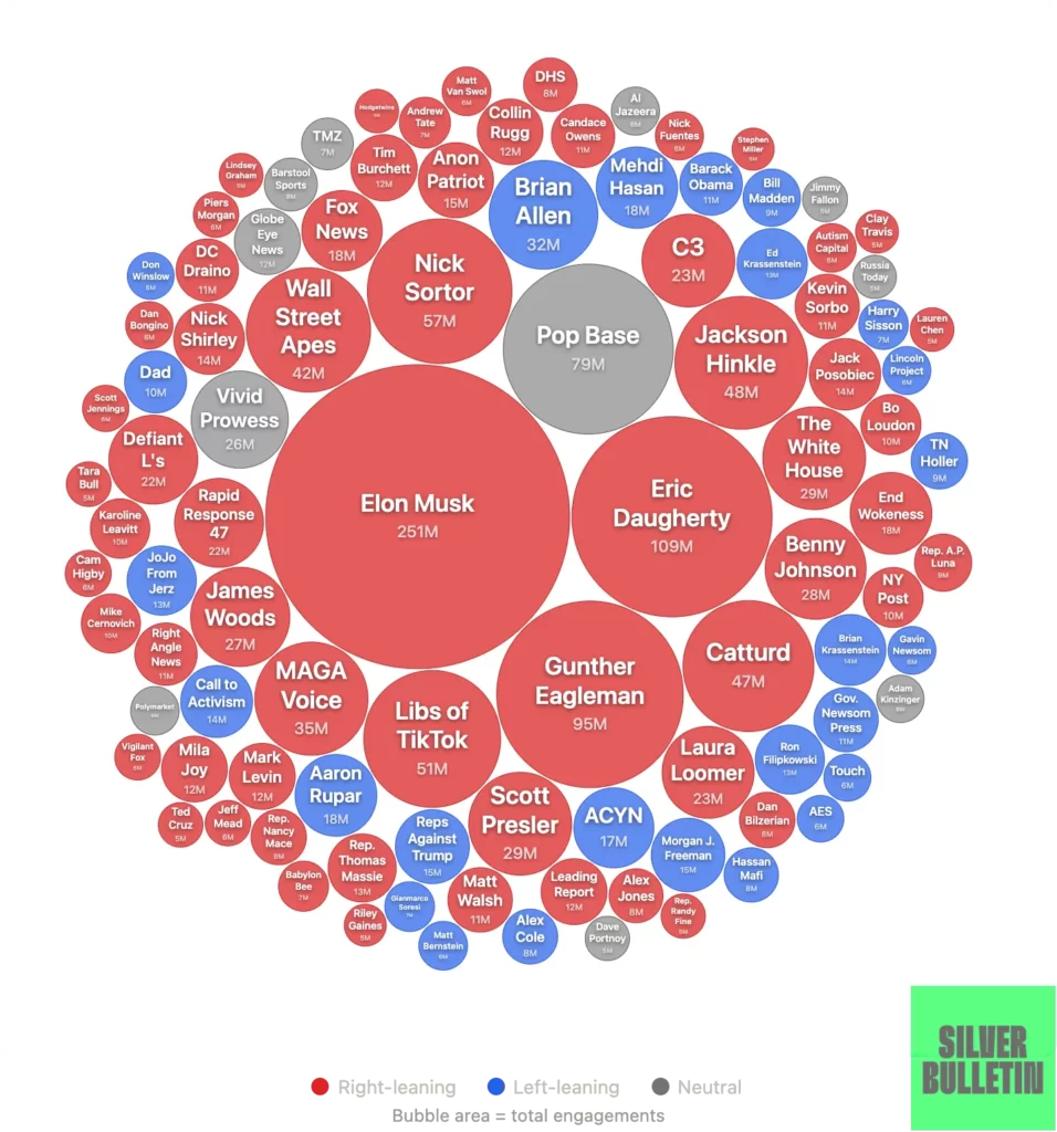 It’s Komodo dragons all the way down: In a new Silver Bulletin post titled “Social media is turning into a freak show,” Nate Silver shares the following chart, displaying X’s most-engaged-with accounts: