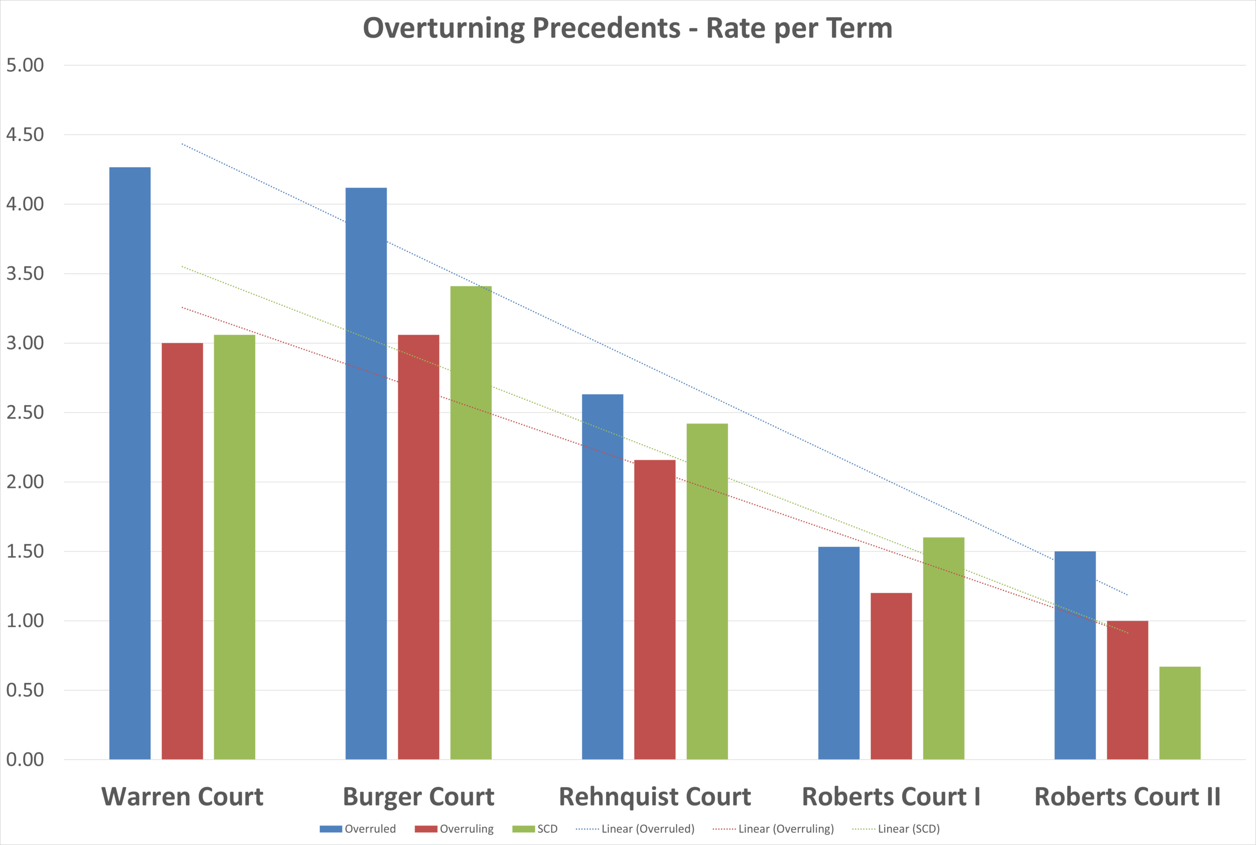 If one divides the Roberts Court into the first Roberts Court (2005-2020) and the second Roberts Court (2020-present), the rate at which the Court has overturned precedents is actually lower in the second Roberts Court (although for one of the three measures, the difference is minimal).
