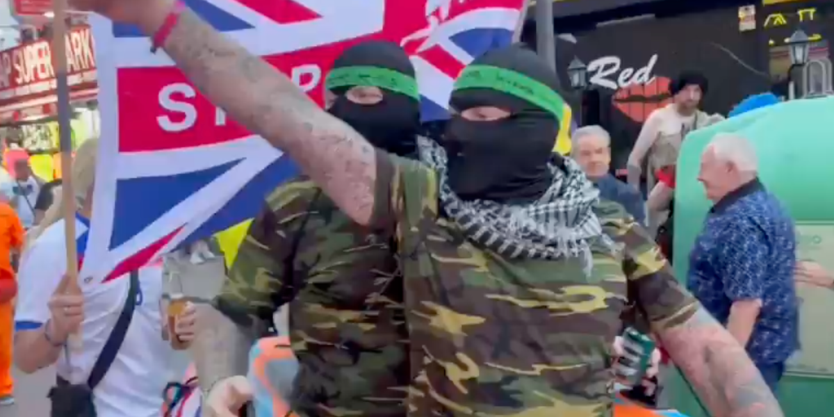A group of Britons appeared to dress up in Hamas-inspired outfits and waved ‘Stop the Boats’ flags as they paraded through the streets of Benidorm.