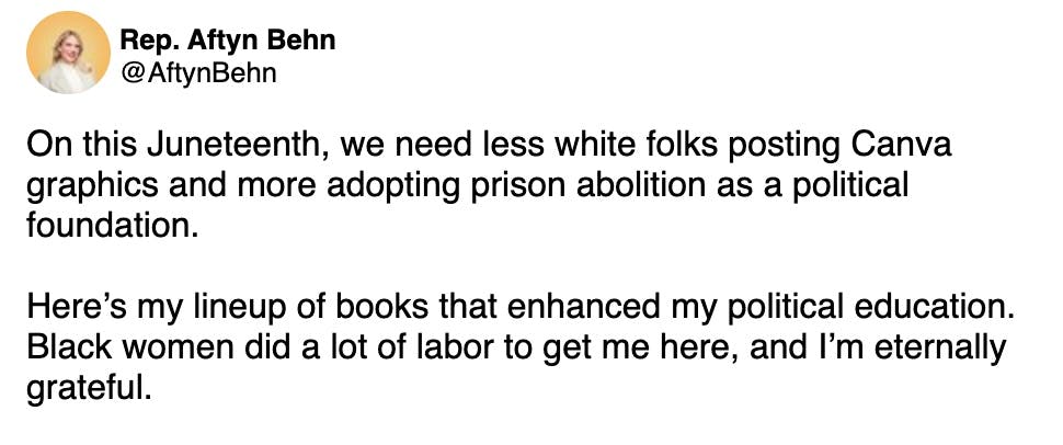 “On this Juneteenth, we need less white folks posting Canva graphics and more adopting prison abolition as a political foundation,” Behn, a white woman, said in a deleted post just over a year ago, that is now archived on the Wayback Machine. The post also recommended four books that “enhanced” her “political education.”