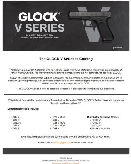 Instead, Glock is caving. They’re punishing every law-abiding gun owner in the country. They just announced that they’re ditching Gen 5 and starting to make a whole new “V series” of handguns that are supposedly compliant with this new law. They just sent this marketing material around.