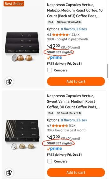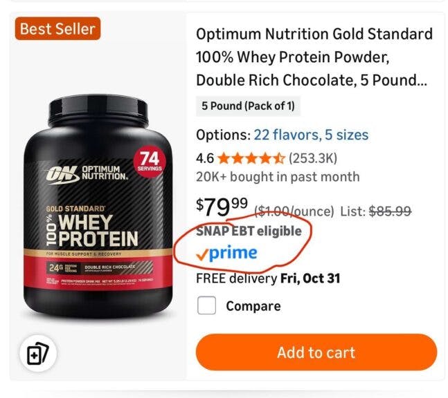 You can even get a massive $80 vat of “double chocolate” Whey protein powder on SNAP, along with your Nespresso capsules.