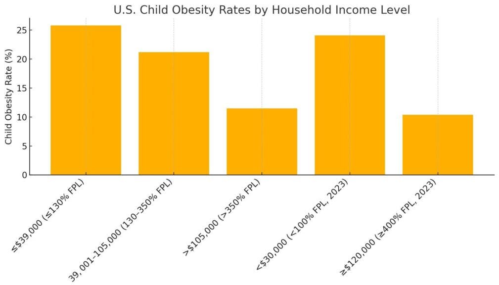 It shows child obesity rates in the US by family income level. What do you notice? The demographic that receives the most food stamps just so happens to have the highest child obesity rate, by a significant margin. Who could’ve seen that coming? We’re not actually improving the lives of children.