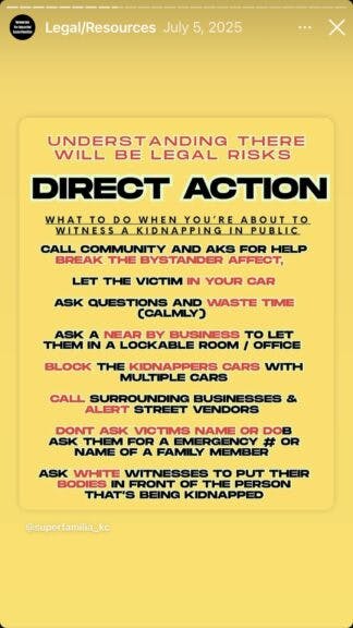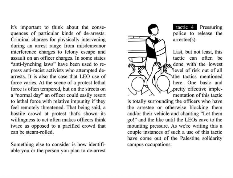 It teaches members how to “de-arrest” illegals. It reads, “One basic and pretty effective implementation of this tactic is totally surrounding the officers who have the arrestee or otherwise blocking them and/or their vehicle and chanting LET THEM GO.”