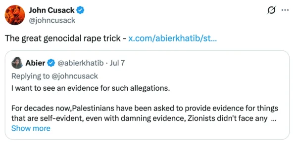 Prominent Hollywood voices denied that reports of sexual abuse, such as Gonen’s, would ever exist. Rosie O’Donnell, Indya Moore, Sara Ramirez, Saul Williams and John Cusack, among many others, have spread rape denial to their millions of followers. In the name of social justice. They owe Gonen an apology. They owe women an apology. They owe everyone who has ever been sexually abused an apology. That’s how this goes, no?