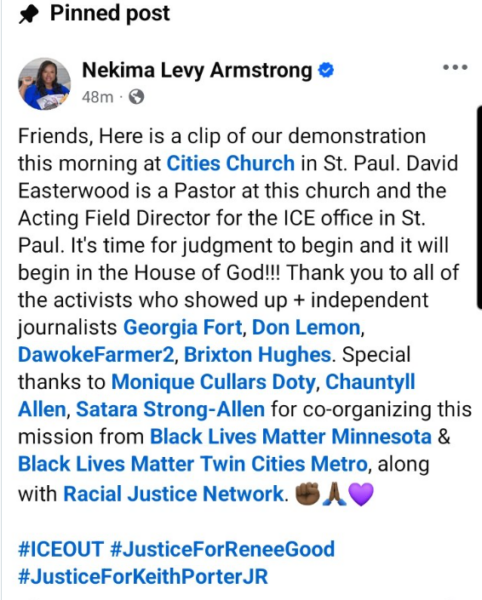 In her pinned Facebook post (screenshot below), Ms. Armstrong not only identifies herself with reference to “our demonstration,” she names both individuals and groups who served as fellow organizers of the riot inside Cities Church. The named groups include Black Lives Matter Minnesota, Black Lives Matter Twin Cities, and the Racial Justice Network. Ms. Armstrong is herself the leader of the Racial Justice Network.