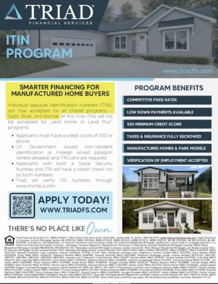 Smarter financing for manufactured home buyers. Individual taxpayer identification numbers (ITINs) are now accepted for all chattel programs — gold, silver and bronze.