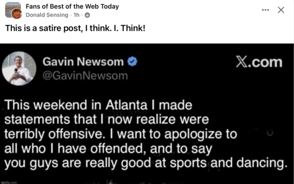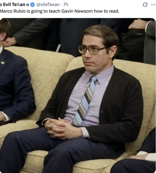 So I gather “mogging,” and/or “mogged” is the new hip term for . . . something . . . among the Gen Z or Millennials, like “flexing” a decade ago. And it seems “maxxing” goes with it somehow. I can’t keep up. But somehow I suspect both terms can be used creatively with Gruesom Newsom, whose 2028 presidential campaign is already over, though he won’t know this for another couple years. Has there ever been a more phony person in politics? Yes, I know there are many contenders, but he has to be at the top of the heap by now. Meanwhile, the one and only job not yet suggested for Marco Rubio is governor of California. Hey—a person can dream, can’t he?