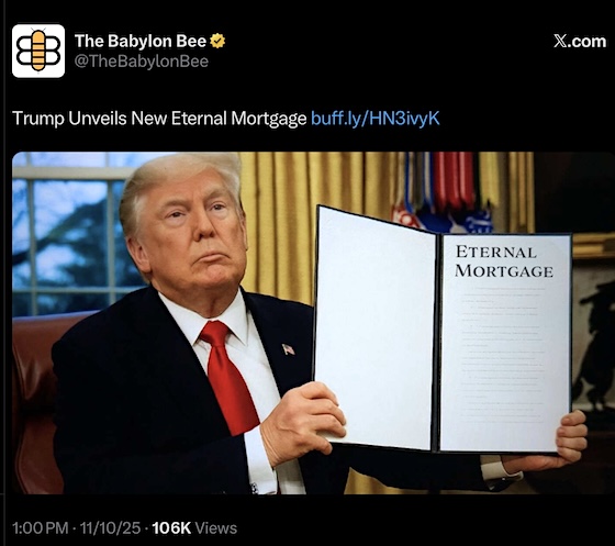 Lots of the week’s memes were leftovers–Mamdani in New York and Sydney Sweeney (most of which I passed on, despite my high regard for Ms. Sweeney). But there were also some new topics, like President Trump’s endorsement of 50-year mortgages, which was not popular in meme world. And socialism remains deeply unpopular.