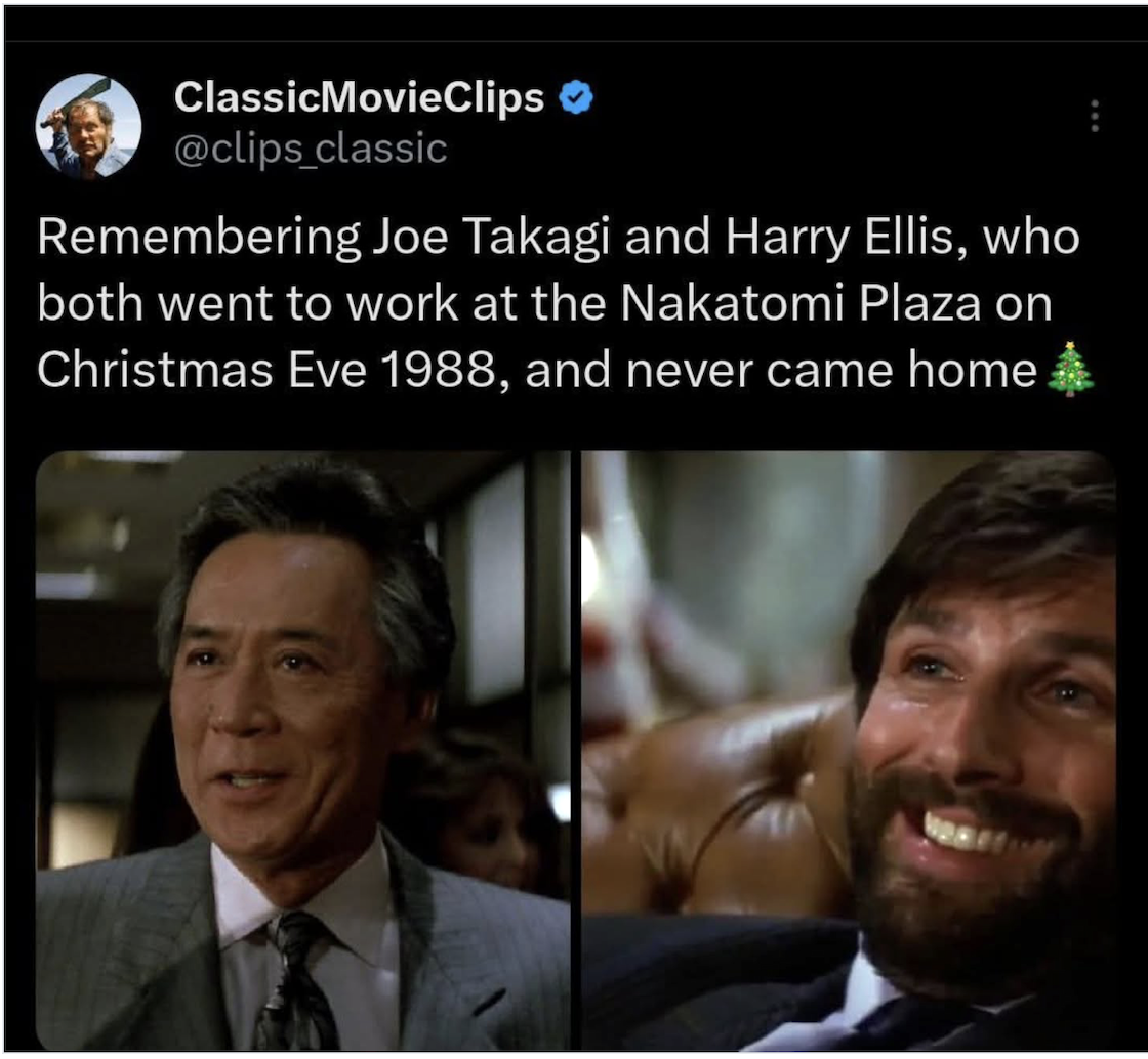 It was not until I got back to civilization that I realized what had happened. The purpose of my kidnapping was to enable Steve Hayward to stage a coup. While I was occupied, he seized control of Power Line’s back end and posted an unauthorized Week In Pictures. Why? To promote the heretical theory that Die Hard is a Christmas movie!