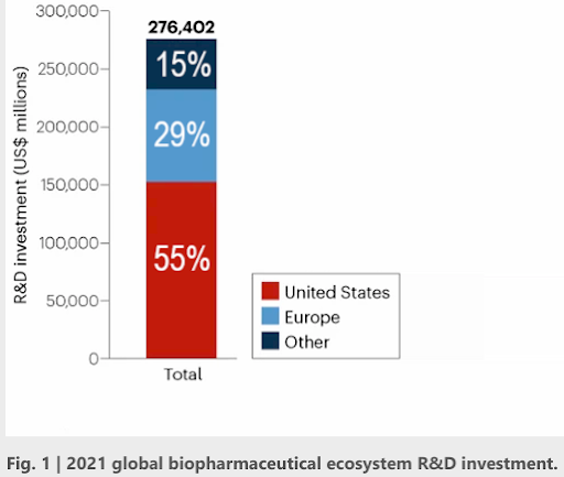 Sally Pipes of the Pacific Research Institute has done a terrific analysis: “the U.S. has swooped in to dominate the field.” She cites a Nature Reviews study that finds roughly 55% of the $276 billion of global pharmaceutical research and development investment in 2021 was by companies headquartered in the United States, compared with just 29% to Europe: