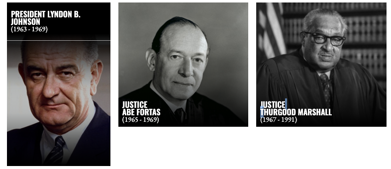 11/22/1963: President Lyndon B. Johnson takes the oath of office. He would appoint two Justices to the Supreme Court: Abe Fortas and Thurgood Marshall.