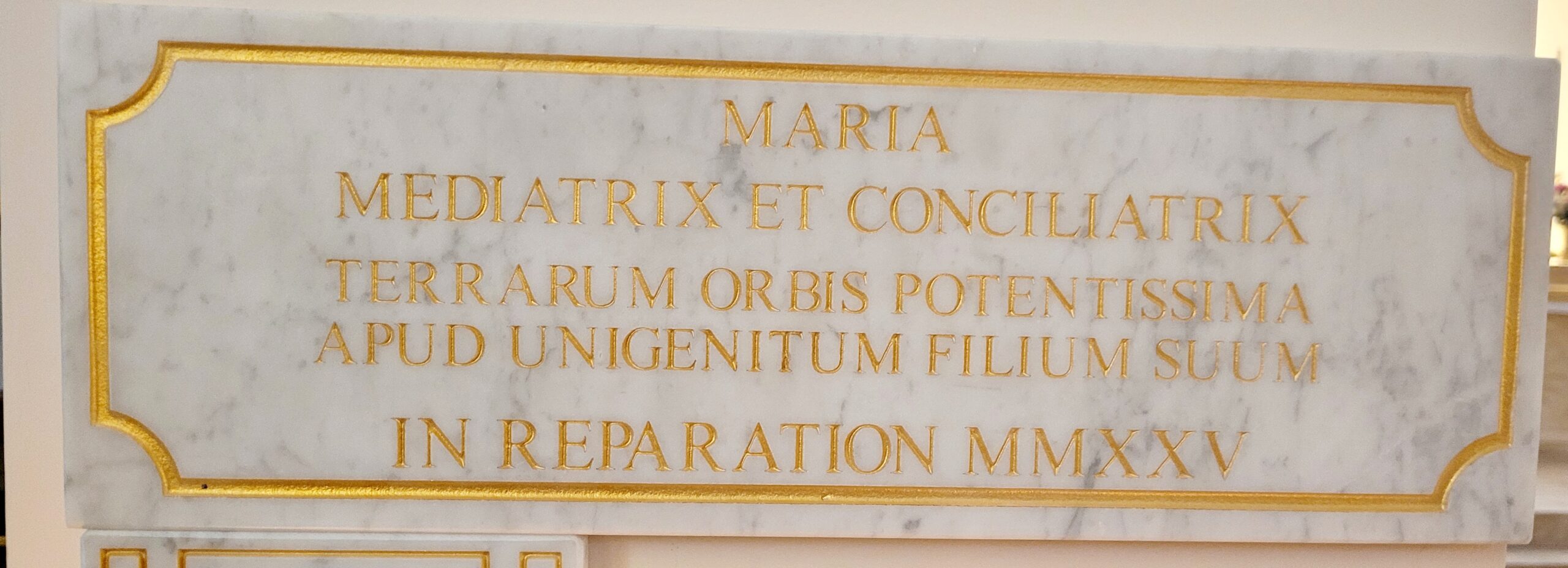 The plaque will also serve as a historical witness to the truth of those titles which will no longer be used in Rome. I want posterity to know that St. Michael’s continued to venerate Our Lady as the Co-Redemptrix of the human race and as Mediatrix of all those graces we so desperately need.