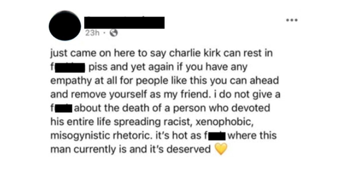 A South African national said that Kirk’s mourners are “hurt that the racist rally ended in attempted martyrdom” and alleged that “he was used to astroturf a movement of white nationalist trailer trash.”